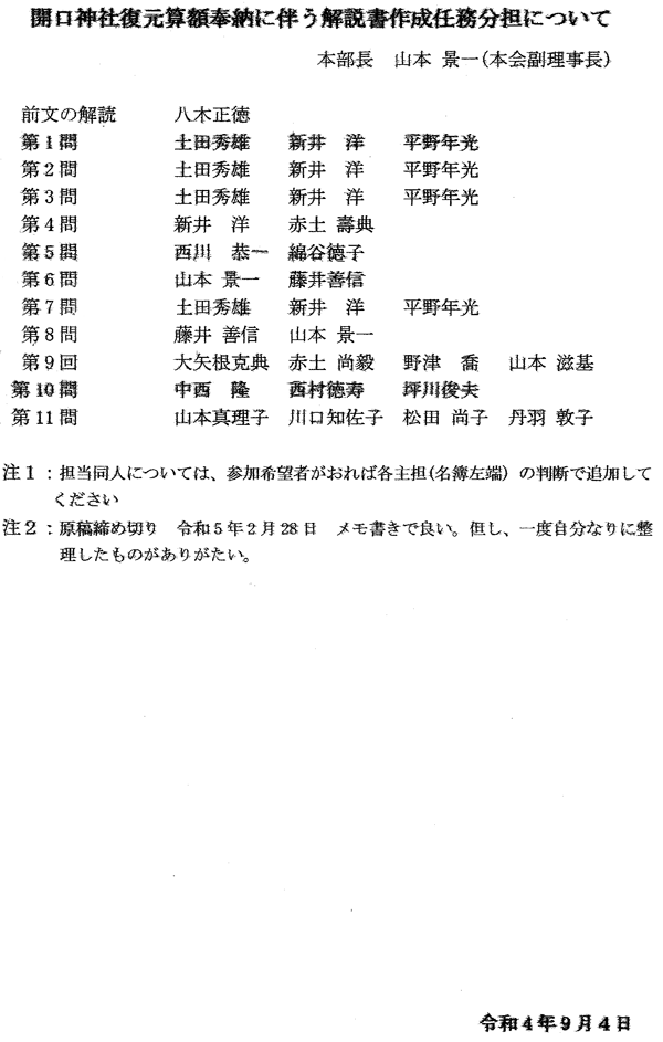 令和4年8月27日(土)、桃山学院教育大学にて、開口神社焼失算額復元事業委員会の立上げ会がありました。この事業には二つの側面があり、一つは焼失した算額を復元して開口神社に再掲示することと、もう一つは復元算額の解説書を作りあげることです。前者は本会高校部会が担当し、神戸市西区の業者に依頼して、厳島神社算額復元と同じ方式での再現を目指します。後者は、漢文で記されている算額文の解読と問題の解答を作りあげることです。高校部会員は無論ですが、広く会員外の皆様にも参加いただくことになりました。解説書の作成本部長には、本会副理事長の山本景一氏にご就任を願いたしました。