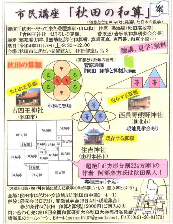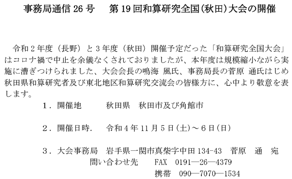 2022年10月14日 / 最終更新日時 : 2022年10月14日 wasan 未分類 通信ー26ー 第19回和算研究会全国(秋田)大会の開催 Tweet Pocket Follow me! FacebooktwitterHatenaPocket コメントを残す コメントをキャンセルメールアドレスが公開されることはありません。 * が付いている欄は必須項目ですコメント 名前 * メール * サイト 次回のコメントで使用するためブラウザーに自分の名前、メールアドレス、サイトを保存する。