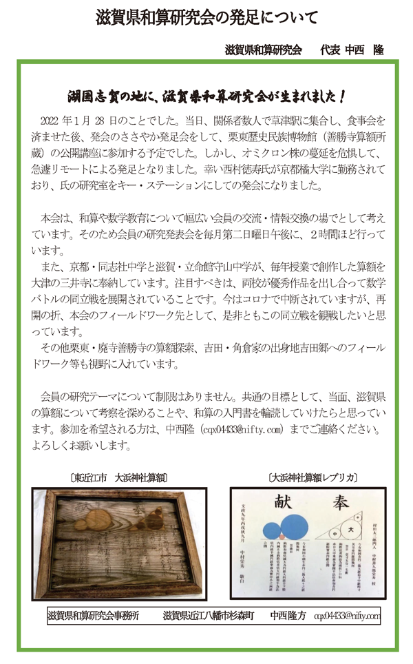 2022年10月14日 / 最終更新日時 : 2022年10月14日 wasan 未分類 通信ー28ー 滋賀県和算研究会の発足について Tweet Pocket Follow me! FacebooktwitterHatenaPocket コメントを残す コメントをキャンセルメールアドレスが公開されることはありません。 * が付いている欄は必須項目ですコメント 名前 * メール * サイト 次回のコメントで使用するためブラウザーに自分の名前、メールアドレス、サイトを保存する。
