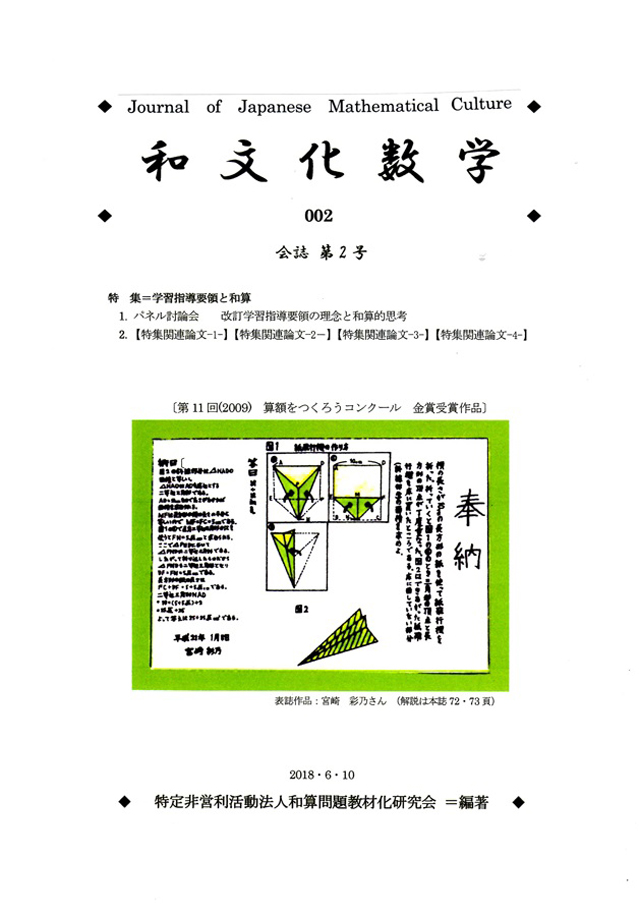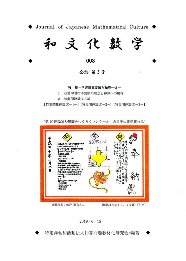 私と和算の出会い 八木 義宏 「改訂学習指導要領の理念と和算的思考について」を受けてーー 【特集関連論文ー2-】 郷土の数学文化遺産の発掘とその教材化 -堺市開口神社奉納算額第ニ問の教材化ー 田良原 俊 【特集関連論文ー3-】 「接触多数円」の授業 ー中学1年生での実践を通してー 大谷 翔平 【特集関連論文ー4-】 私の問題解決の過程 ー摂州清水寺奉納算額第二問の解決を通してー 吉村 駿汰 【特集関連論文-5-】と【特集関連論文-6-】は創刊号に掲載 3. 表紙のその解説 山本 景一 【演 題】 編集後記に換えて |