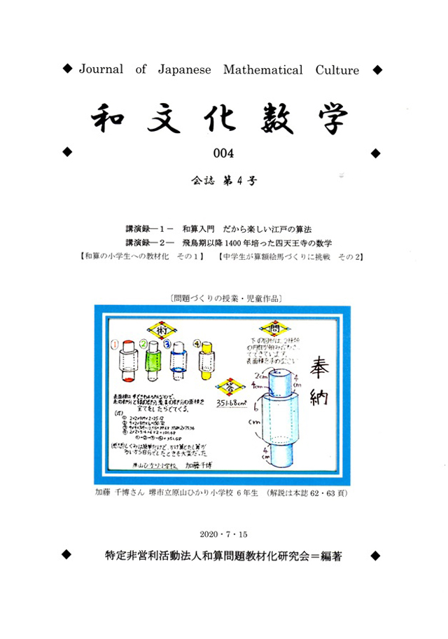 | 1. 巻頭随想 算 額 最 中 小西 豊文 2. 和算の小学生への教材化 ーー問題作り」を生かした取り組み・その2ーー 西川 恭一 綿谷 徳子 3. 和文化随想 (1) コロナ・ウィルスと読書 ーー籠る生活を充実させるためにーー 鈴木 武雄 (2) 中学生の『算額』絵馬づくりに挑戦! ーー表誌掲載算額の解説ーー 園田 毅 4. 特別寄稿 長野県の二つの取り組み >ーー全国和算研究大会と算額の修復ーー 関口 哲男 田中 秀明 長野県和算 研究会 5. 中国古典「魏志倭人伝」とその教材化 (1) 魏志倭人伝の教材化・まとめ ーー数学を含む教科横断的学習への授業の創造ーー 筒井 寿夫 (2) 筒井論文に関する私の意見―-その1 魏志倭人伝・その思考の旅 ーー子どもが旅する邪馬台国への道ーー 濱本 教行 (3) 筒井他論文に対する私の意見――その2 魏志倭人伝の教材化とその教育的価値 ーー本誌第4号掲載論文の教材開発に対してーー 岩城 良宏 6. 「算法地方大成」における二つの数学 ーー数学を内包した教科横断的学習への示唆ーー 中西 隆 7. 泉州堺 開口神社奉納算額 ーー解読と解答及びその教材化・その1ーー 土田 秀雄 新井 洋 大矢根 克彦 山本 滋基 平野 年光 8. 算木を使って計算してみよう ーー算木入門・四則演算と鶴亀算ー 藤原 直幸 9. 算額問題の教材化 ーー垜術問題の小学生への教材化に向けて-- 山本 景一 10. 新刊算法起の解読と解説 ーーその2・第十三 普請遠近割と第十四 知行割に焦点化して-- 土肥 俊夫 11. 和算探訪 ―その2― 塵 劫 記 ーー俵杉算 蛇篭 盗人算 円周率 井堰-- 中井 保行 12. 講演録 『天地明察』の和算 和算を普及する会理事長