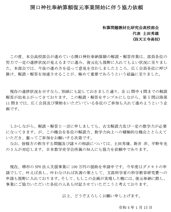通信ー16- 開口神社奉納算額復元事業開始に伴う協力依頼