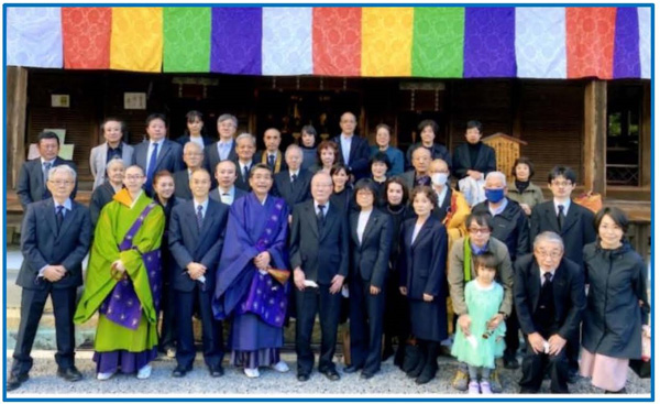 (中央左が二尊院住職 田立智焼氏、中央右が一族会会長吉田周平氏)
